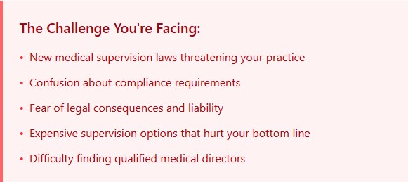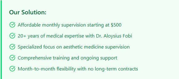 Our Medical Director services starts at $500 per month which includes one Service and one Practitioner, each additional service/practitioner is $250 per month. If you want to provide laser treatments to your clients, this service is $1000 per month because this is a very high risk for the MDs medical license.